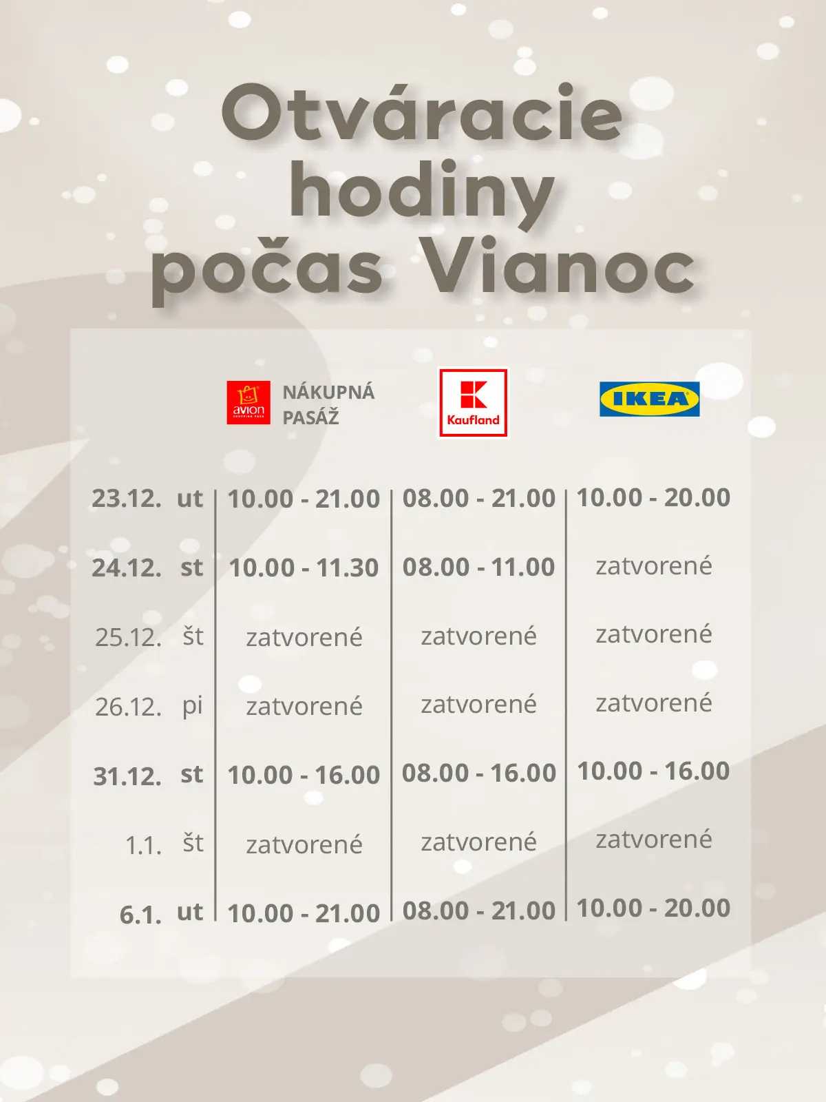 Milí zákazníci, počas vianočných sviatkov budú otváracie hodiny nákupného centra Avion vrátane obchodného domu IKEA nasledovné.