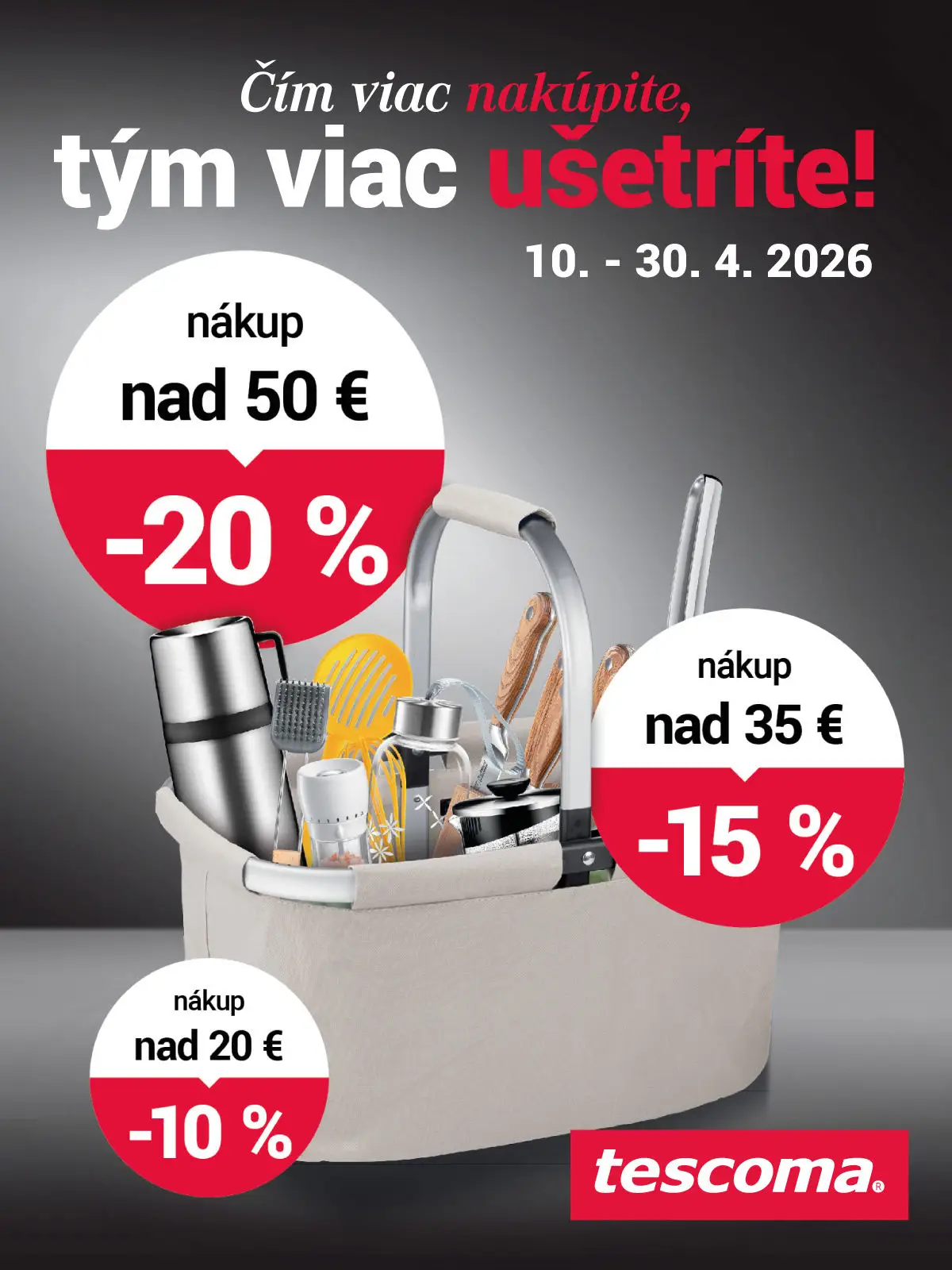 Čím viac nakúpite, tým viac ušetríte. Nakupujte svoje obľúbené produkty TESCOMA a získajte do štvrtka 30. 4. 2026 zľavu až 20 % na všetko podľa výšky vášho nákupu. Viac informácií v predajni TESCOMA.