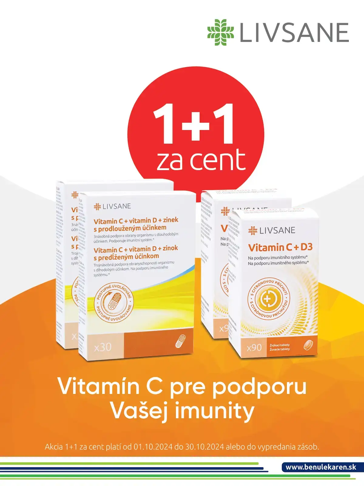 Máte dostatok Vitamínu C? Doplňte si jeho zásobu s našou októbrovou ponukou 1+1 za cent na LIVSANE Vitamín C + vitamín D + zinok s predĺženým účinkom, 30 kapsúl & Vitamín C + D3, 90 žuvacích tabliet.