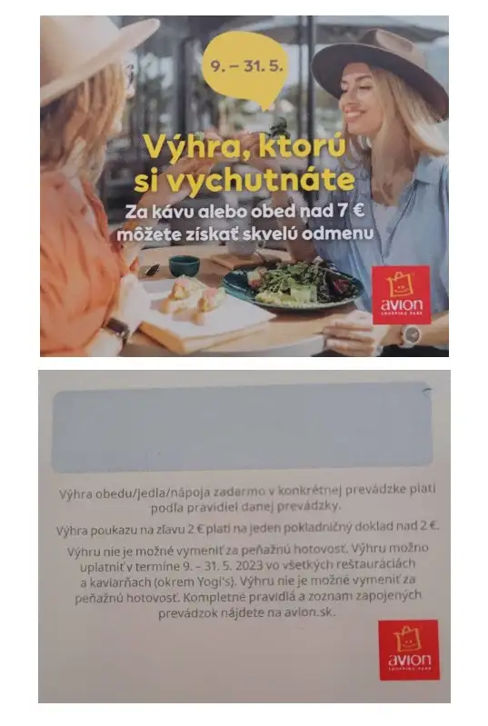 2. Súťažiaci, ktorí získali Okamžitú výhru, si ju môžu uplatniť v závislosti od jej povahy (obedové menu) počas otváracích hodín, resp. v príslušných termínoch u Predajcov a to len v termíne 9. – 31.5.2023.